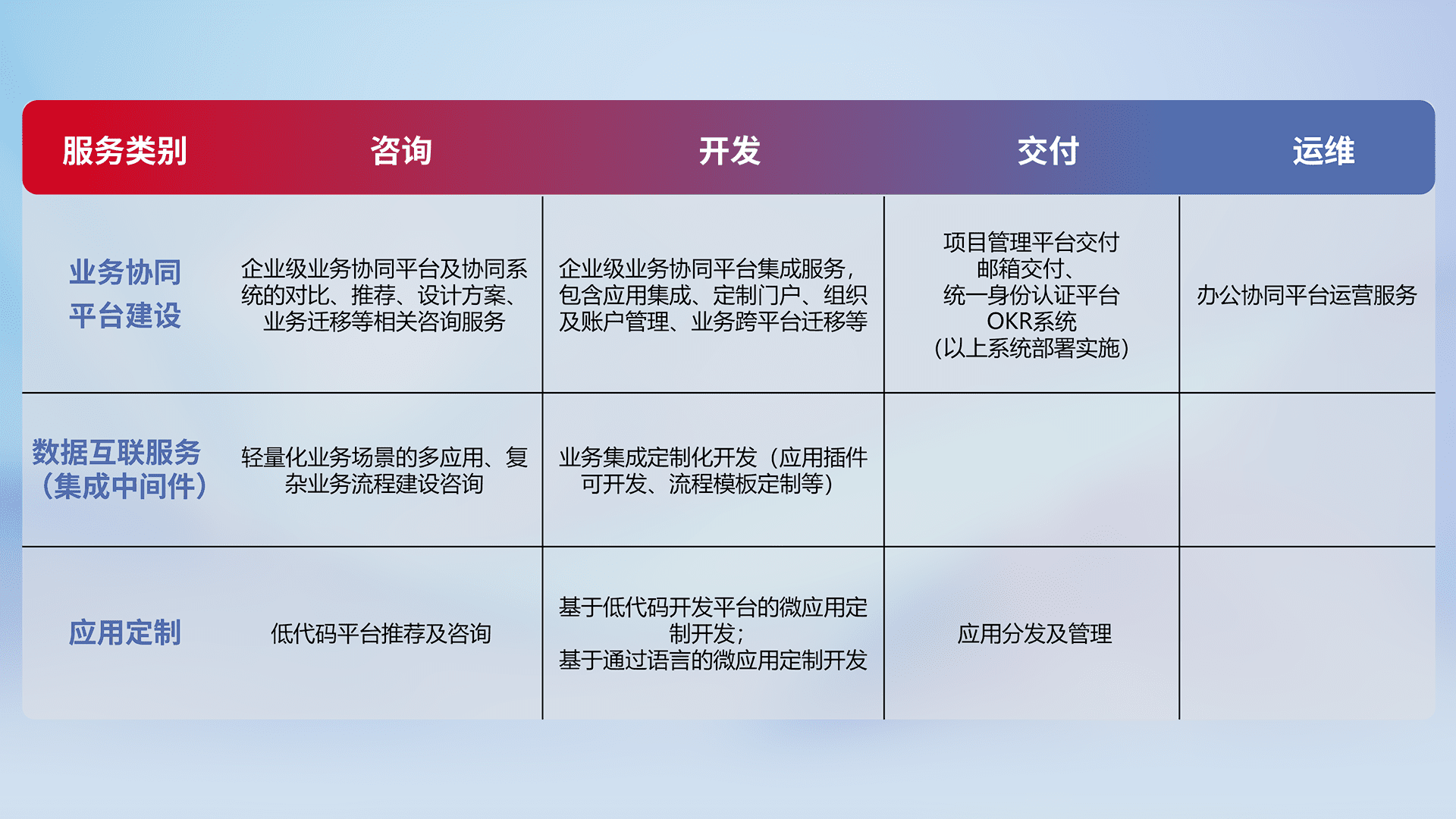 针对钉钉、、、企微、、、、IDaas等平台级产品提供产品的规划、、、、方案、、、交付、、定制化开发等服务,,,,实现如统一协同办公、、、智能客户服务、、、混合会议管理、、智能数据查询、、、、等业务场景,,,实现数字化转型。。。